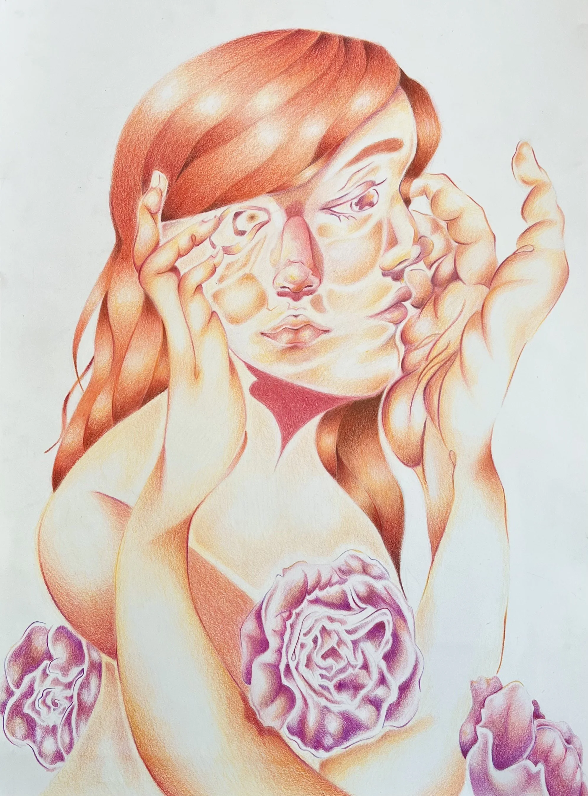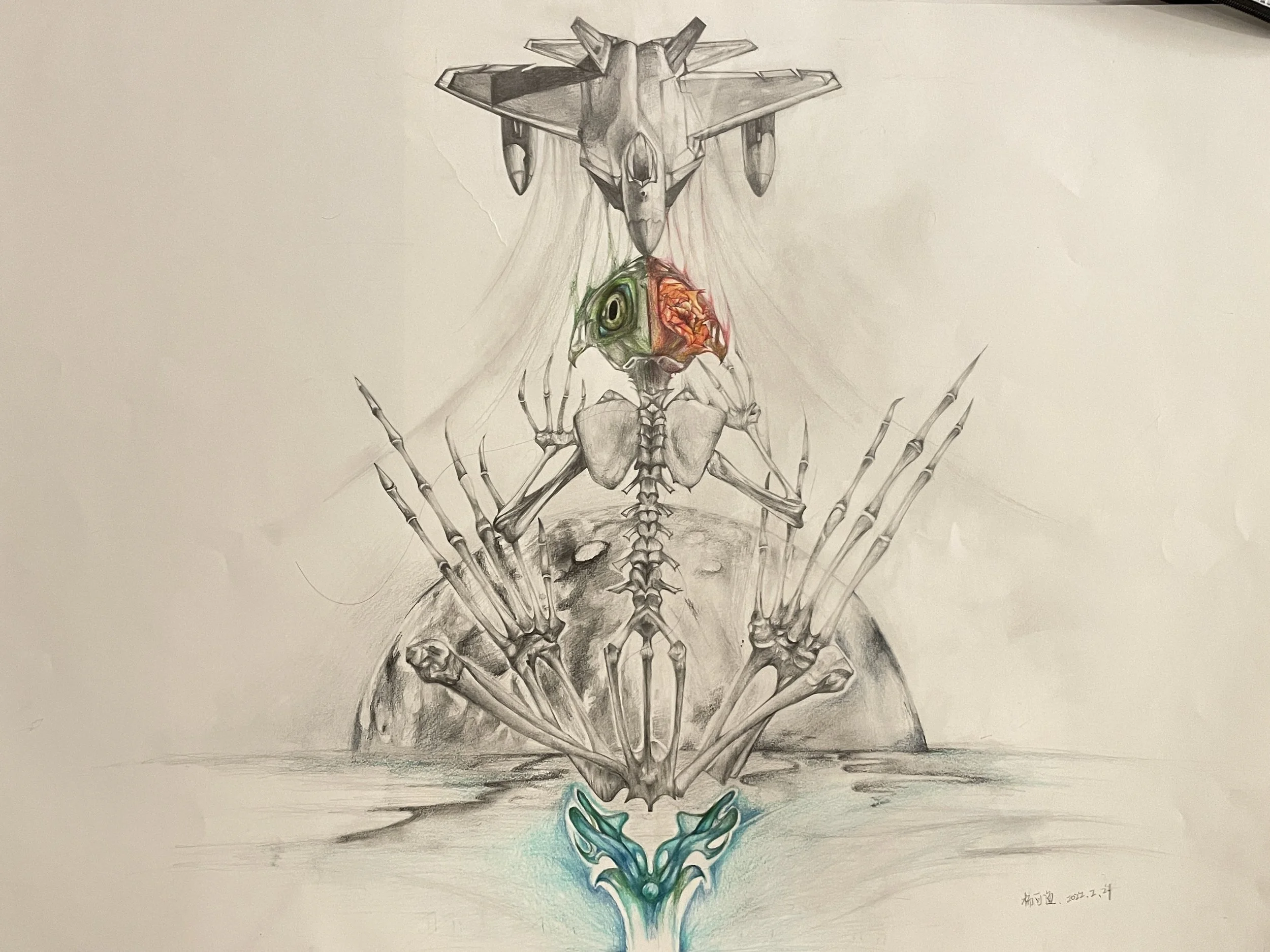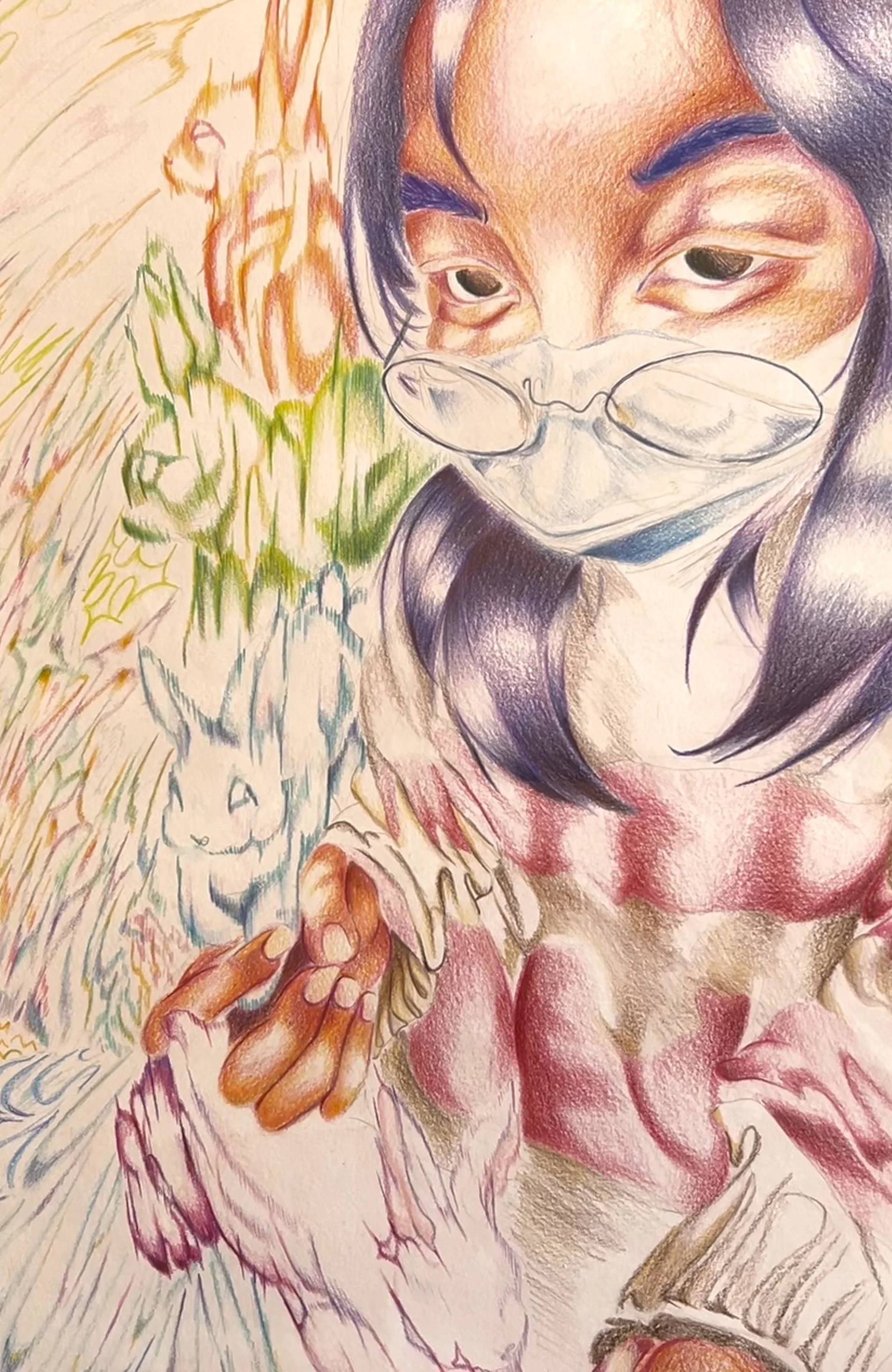 Cardboard, soft pastels, water coloring, Prisma colors, oil pastels, white gel pen, and spray paint
