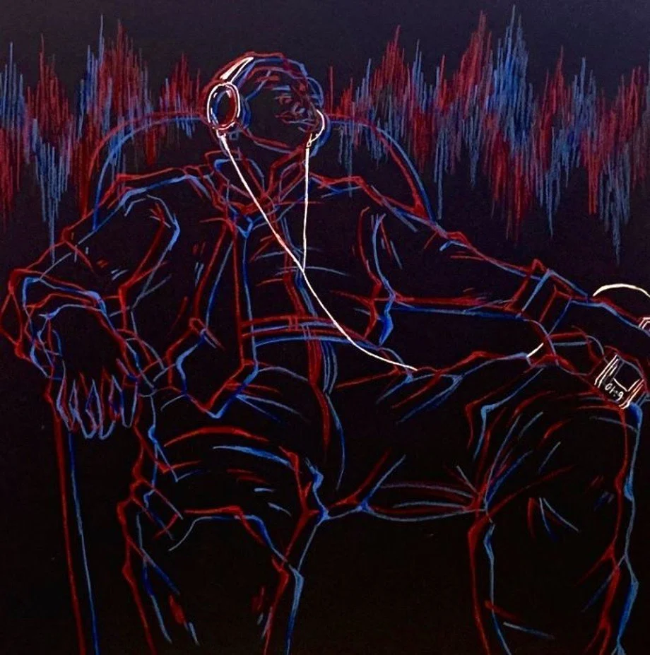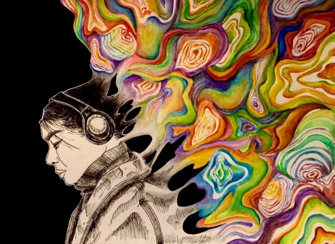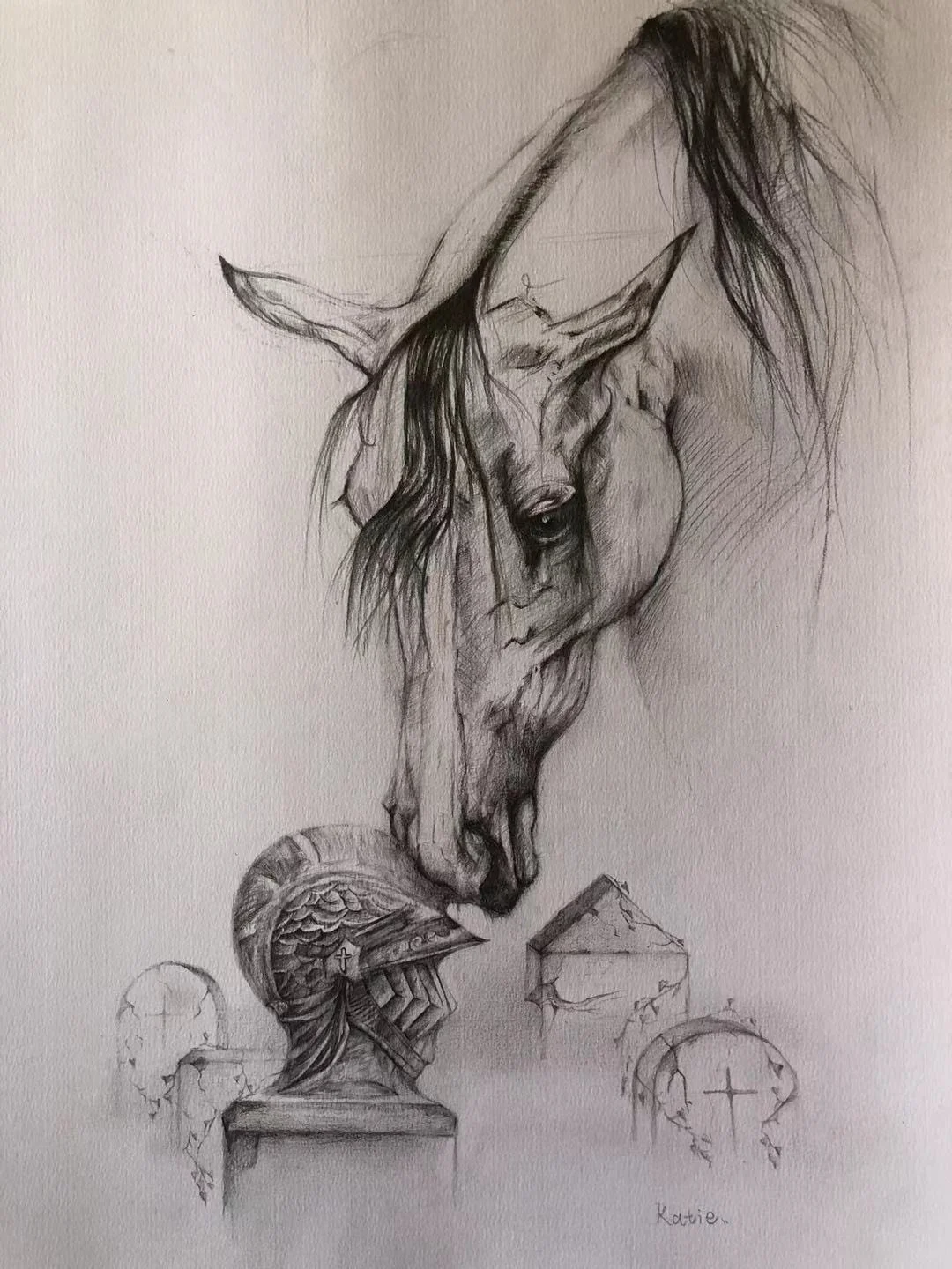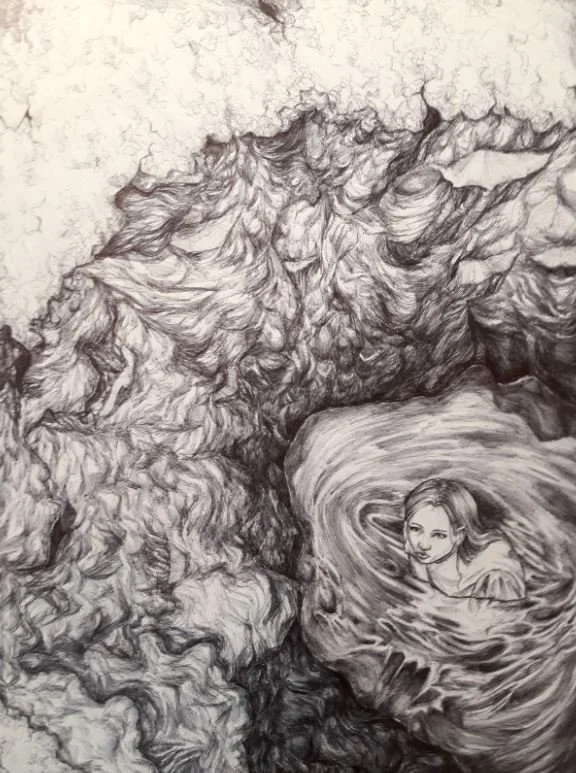 Cardboard, soft pastels, water coloring, Prisma colors, oil pastels, white gel pen, and spray paint