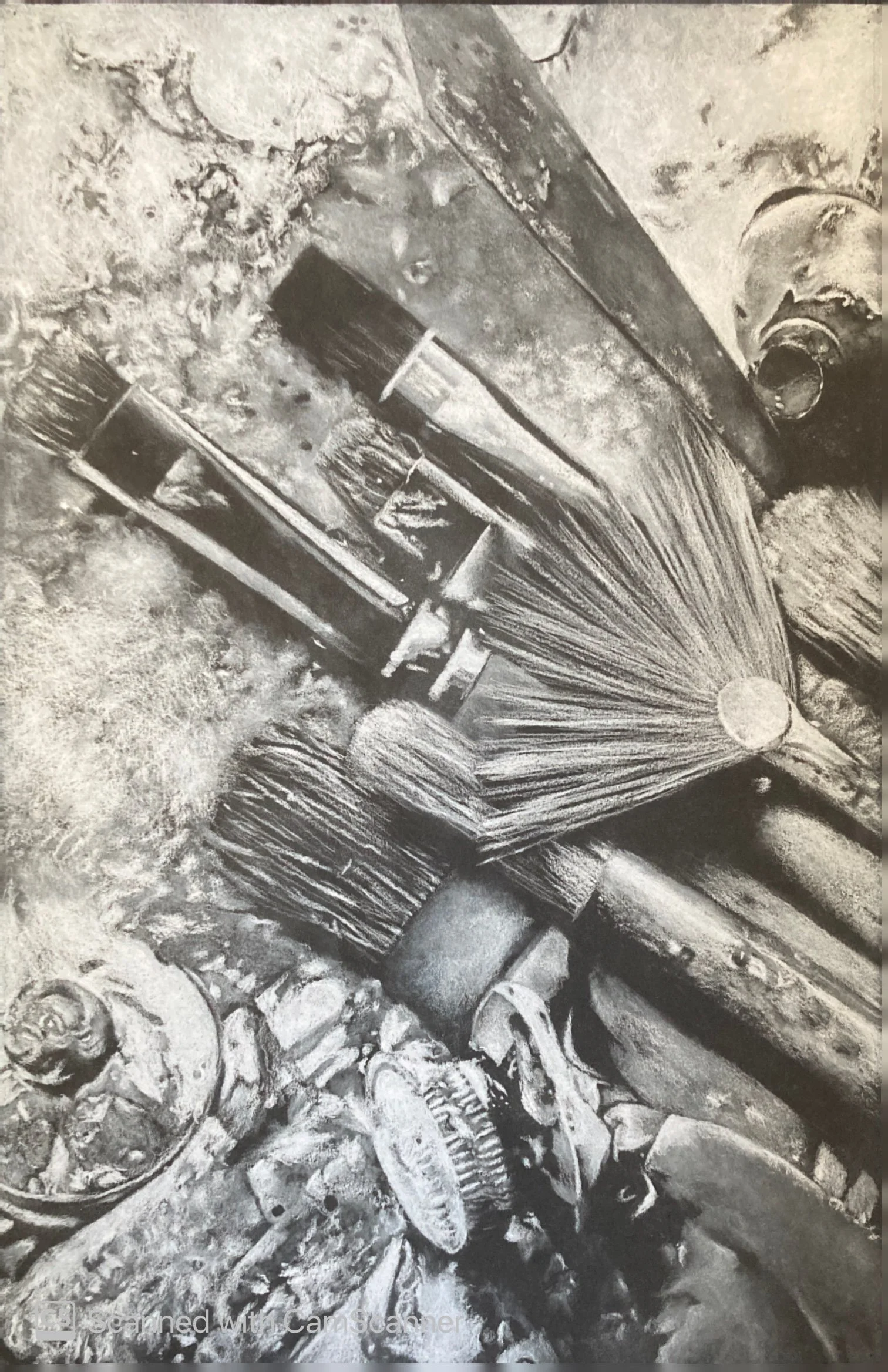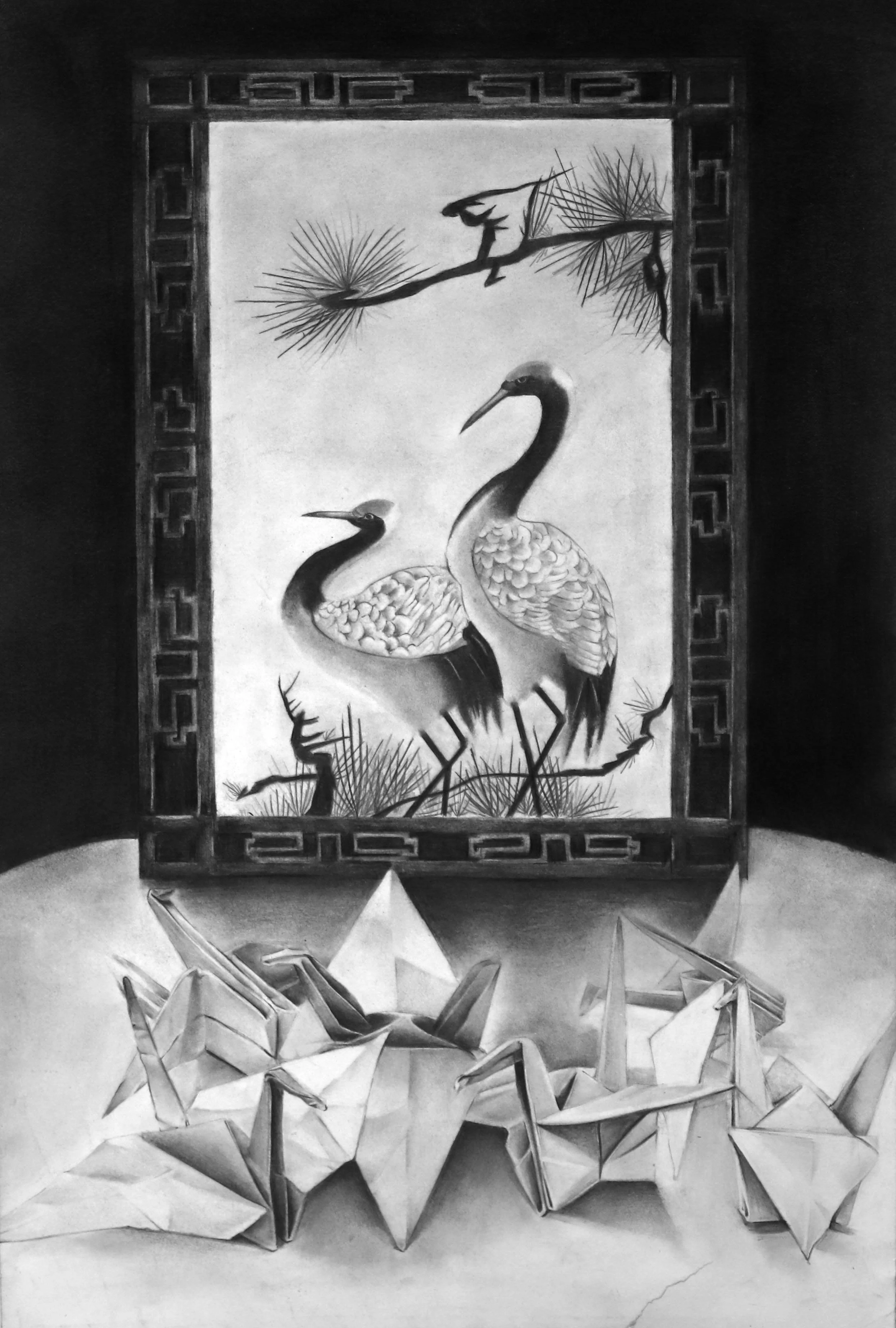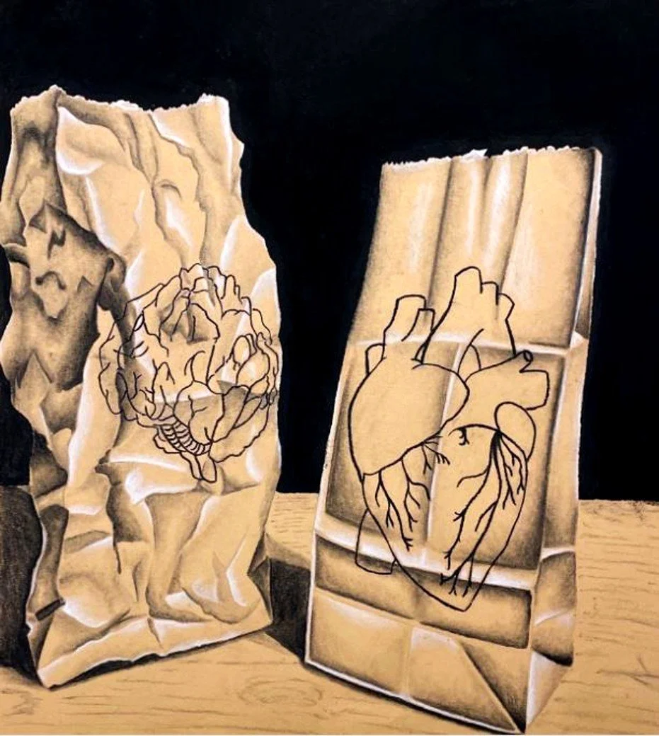 Process: I drew an anatomical heart and brain on 2 separate brown paper bags. Then I crumpled the brain bag and kept the heart bag pristine. We took reference photos in a mini light studio. Then I sketched the peice onto a large brown charcoal paper. I filled in the shadows and highlights of the subject. Finishing it off by darkening the background and adding wood grain to the table.