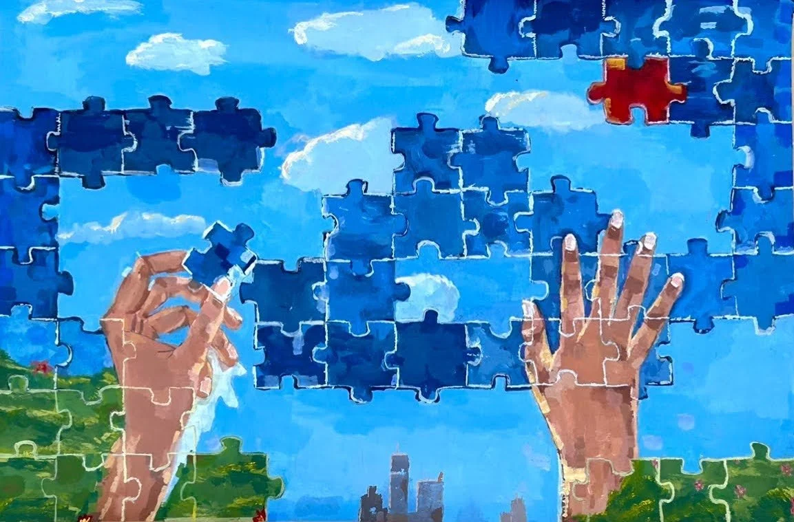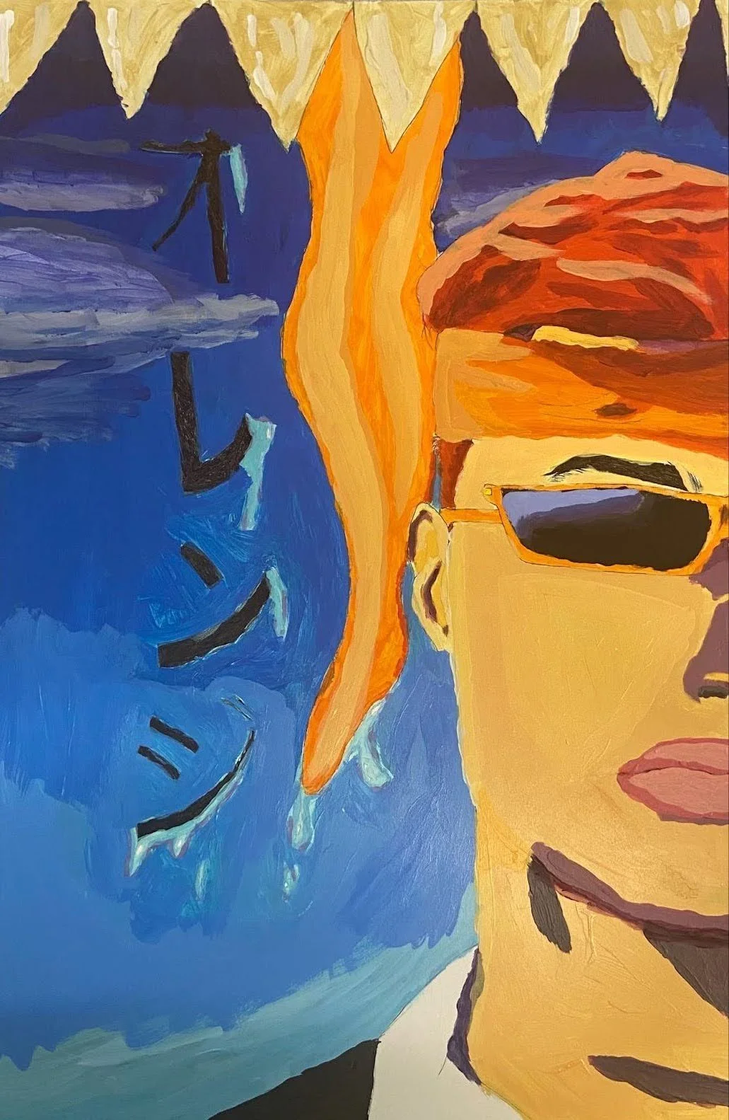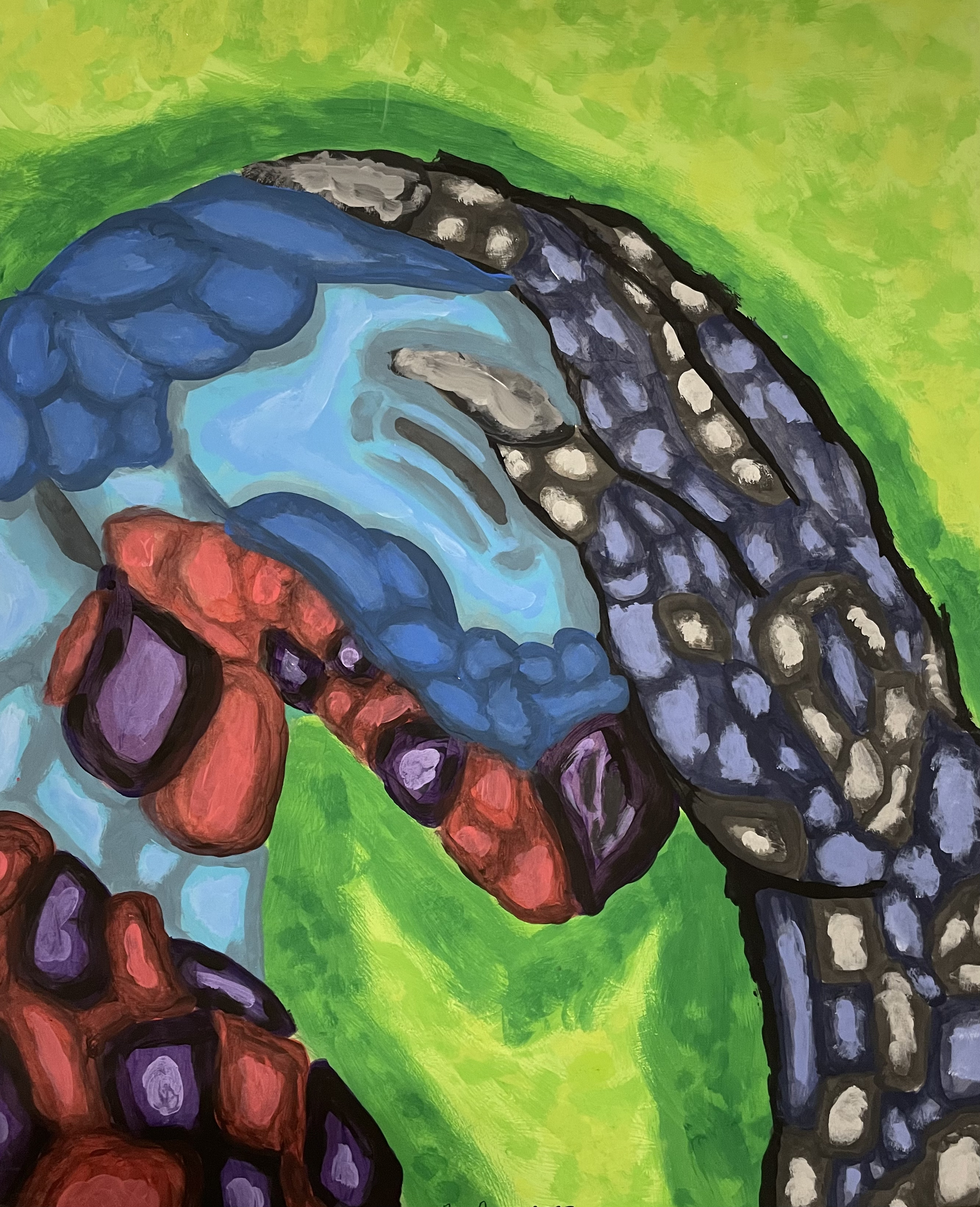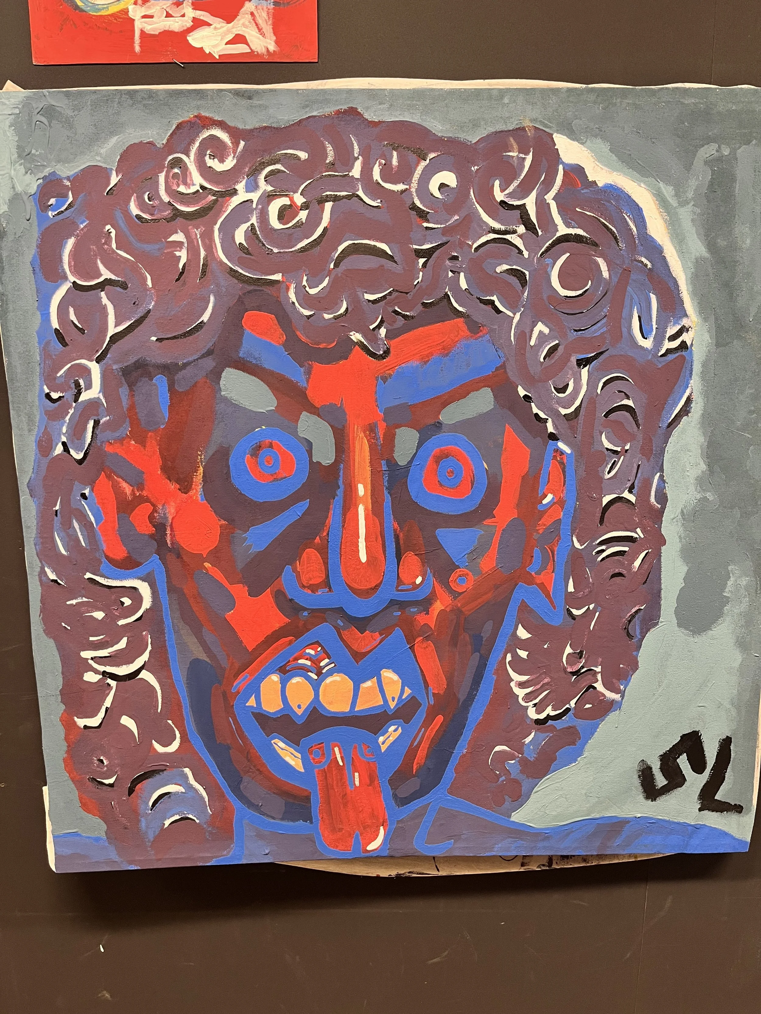 Process: I took a used canvas drop cloth and made a canvas stretcher, then nail gun to attach the canvas to the canvas stretcher with help from one of my teachers. From there I just let my soul flow out of my heart and onto the painting, using strong brush strokes to create vibrancy and unavoidability.