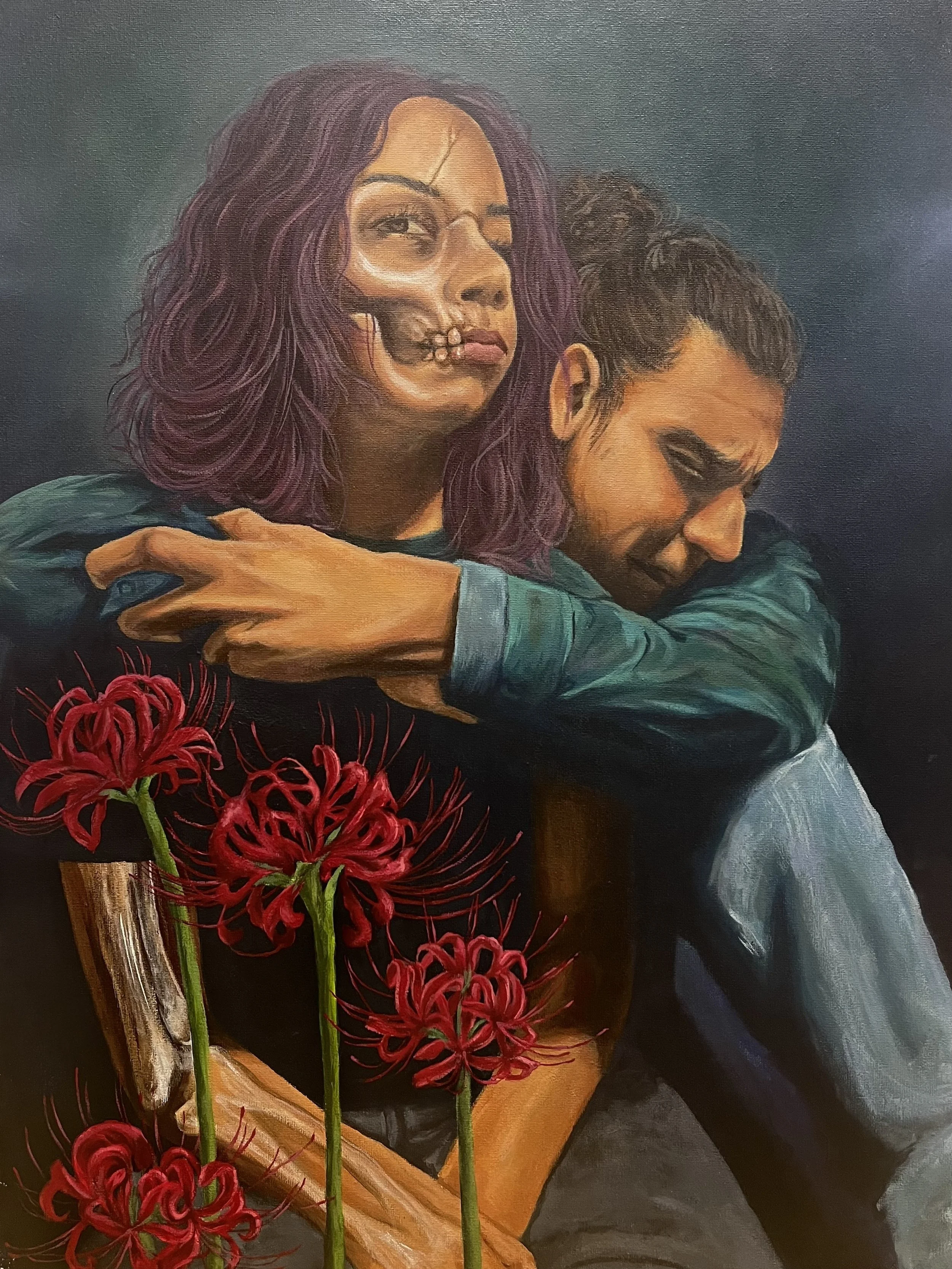 Process: Photographed friends embracing in longing pain. Added skeletal overlay & flowers to symbolize death.