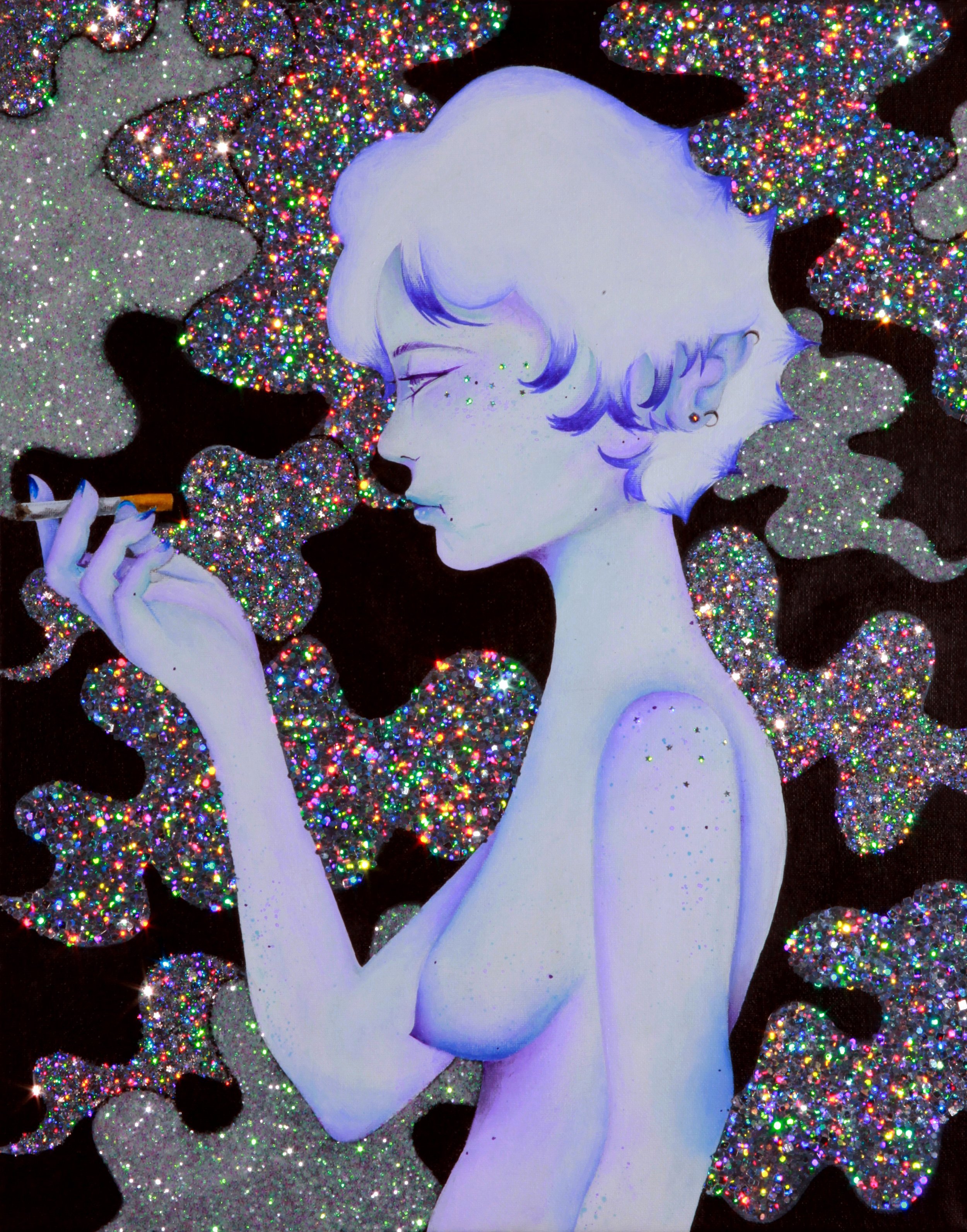 Process: Sketch, underpainting, acrylic painting, outlining, pasting, gluing, applied glitter.